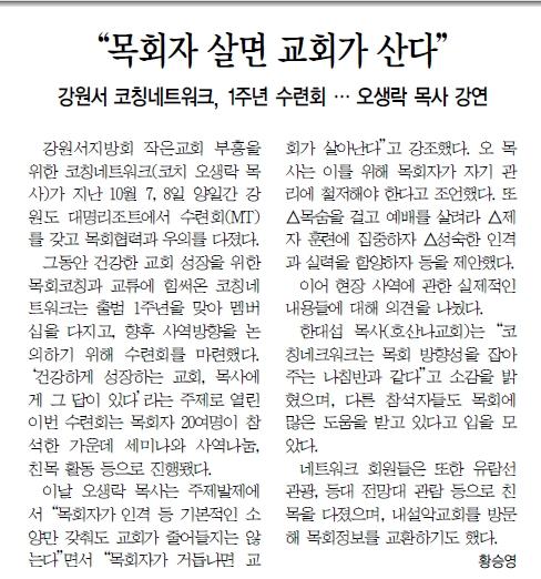 성결신문> 강원서 코칭네트워크 수련회 (2012.10.20일자)